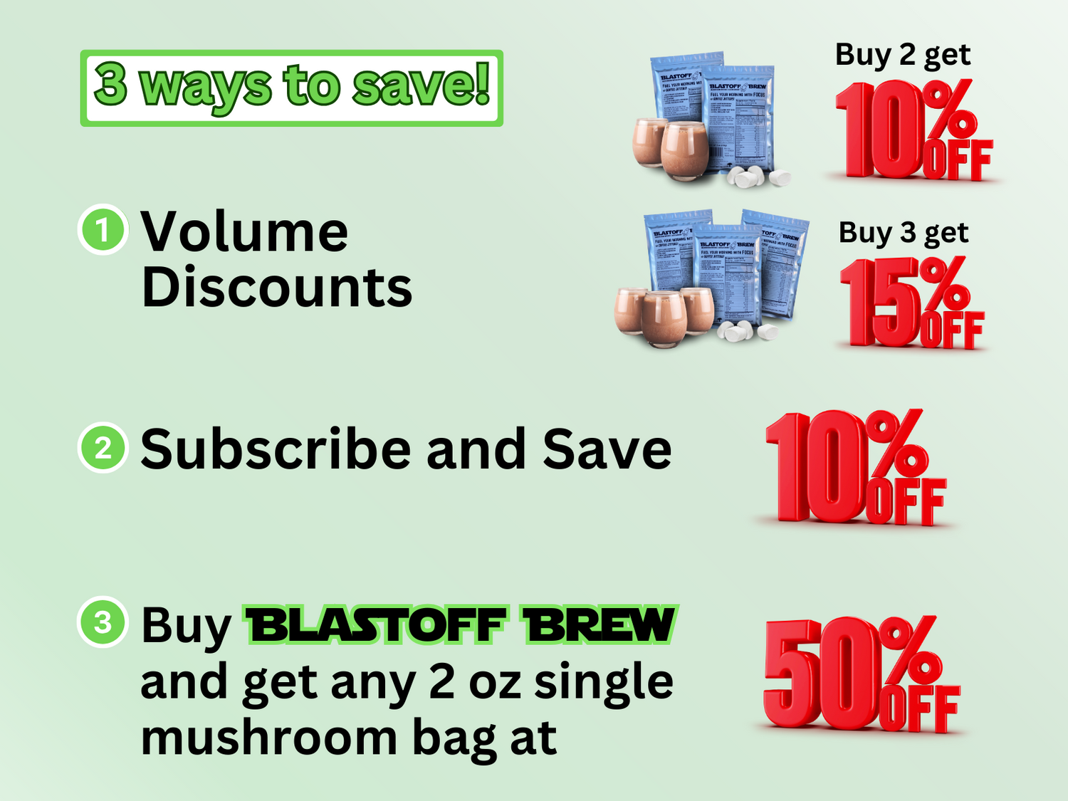 When you add Blastoff Brew to your cart, go to the single mushroom page HERE, and select any 2 oz mushroom powder and get it at 50% OFF at checkout!