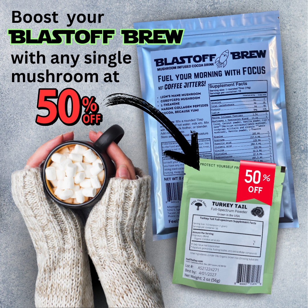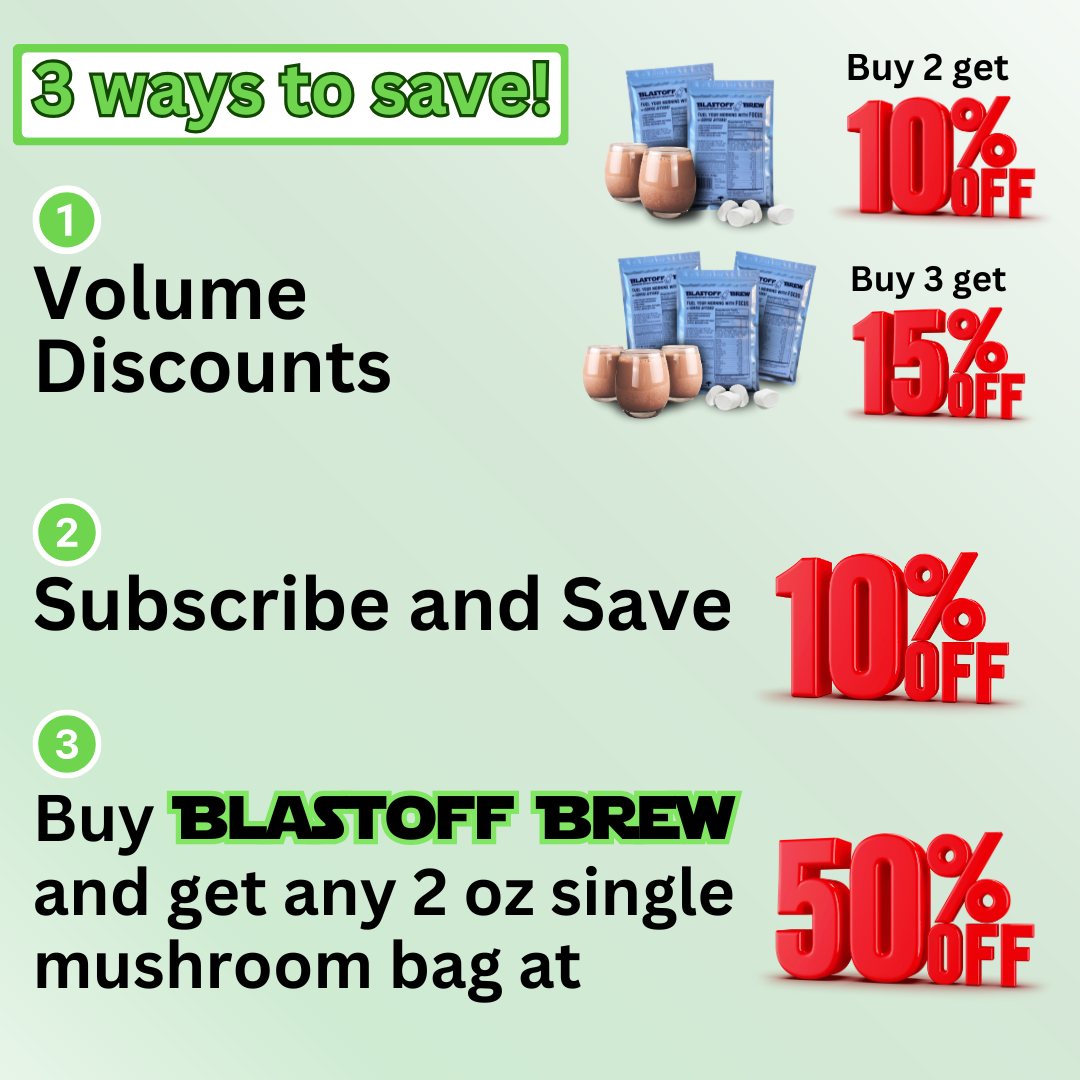 1. Boost your Blastoff Brew! Add Blastoff Brew to your cart, and go to the single mushroom page HERE, and select any 2 oz mushroom and get it at 50% OFF at checkout!