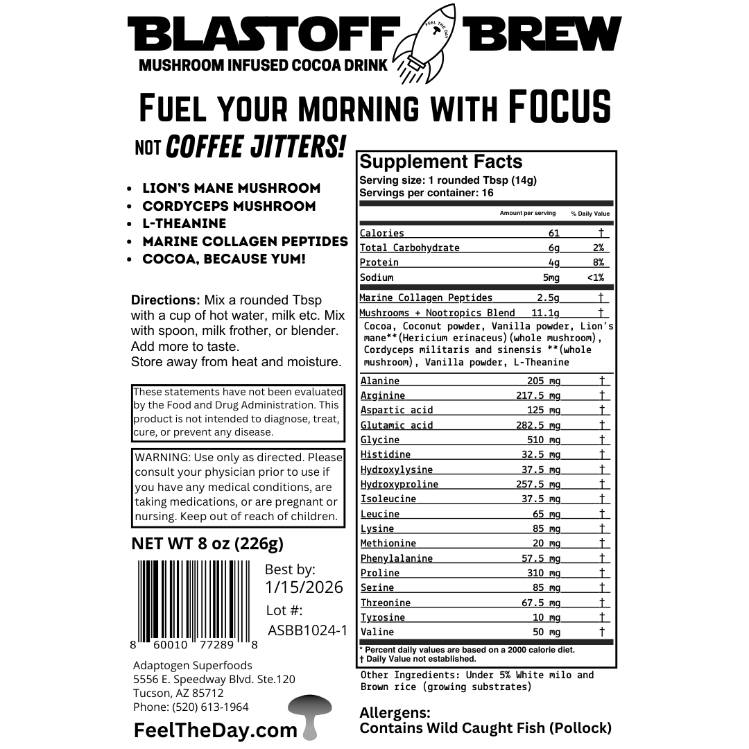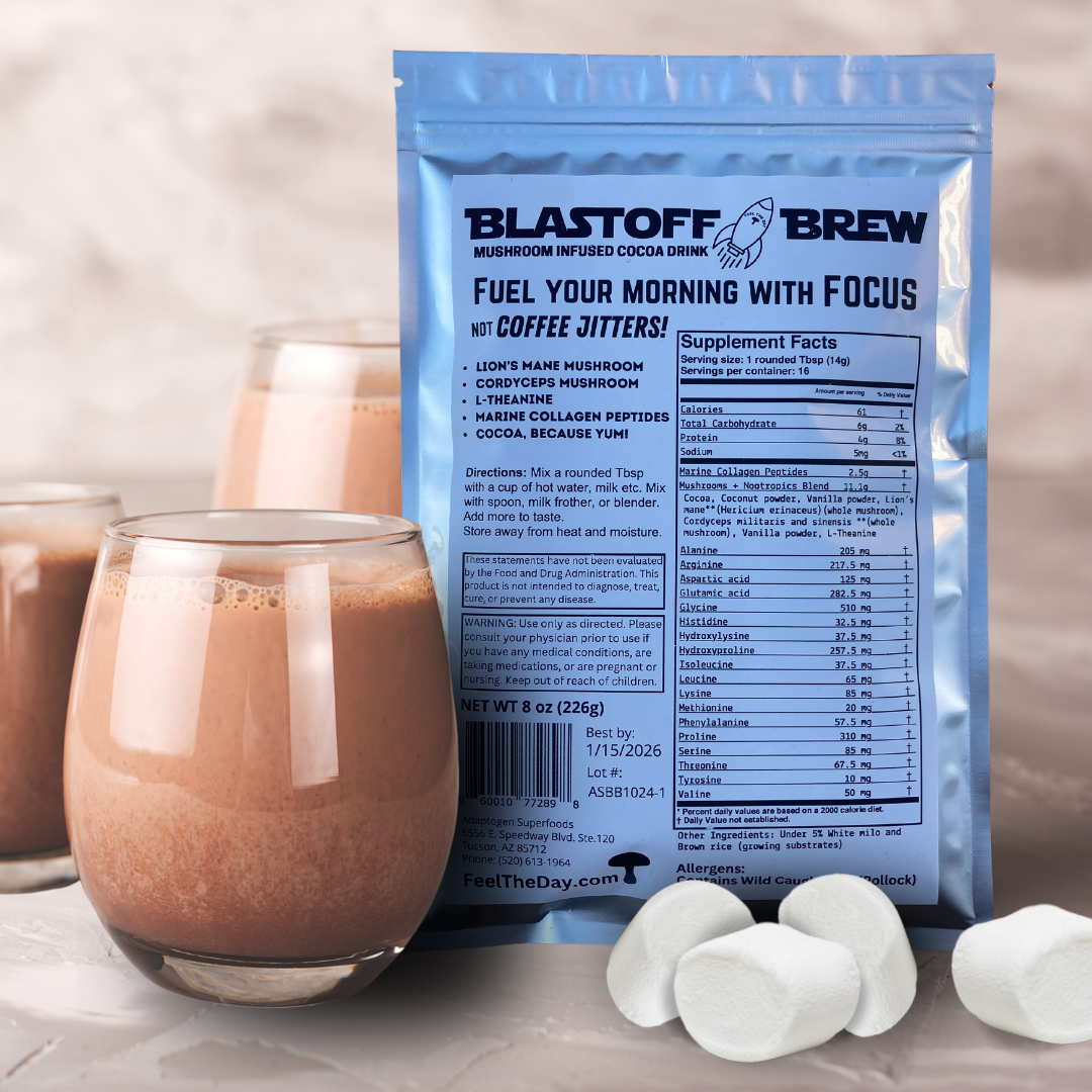 Blastoff Brew by Feel The Day® is a mushroom and collagen cocoa drink that starts your day off right! Powered with the highest quality mushrooms from Feel The Day® including 500mg of Cordyceps mushroom to give you lasting energy and 500mg of Lion's mane mushroom powder to give you that focus and clarity you need to get things done! It also contains 4g of Protein to kick start your metabolism! Just sweeten to taste, and have a better morning.
