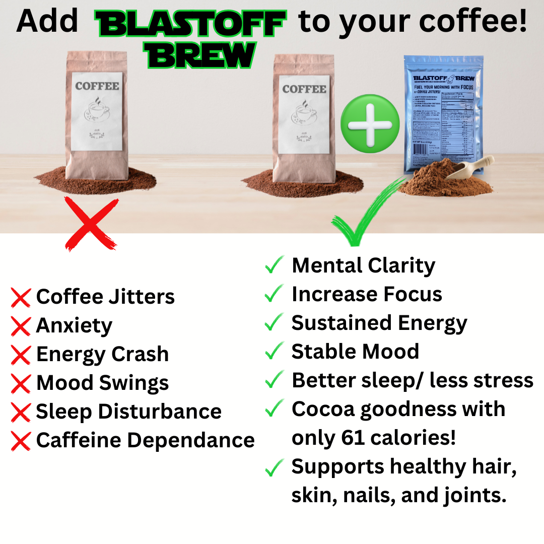 You can even add Blastoff Brew to your coffee to make a Blastoff Mocha that helps with all the side effects of coffee!