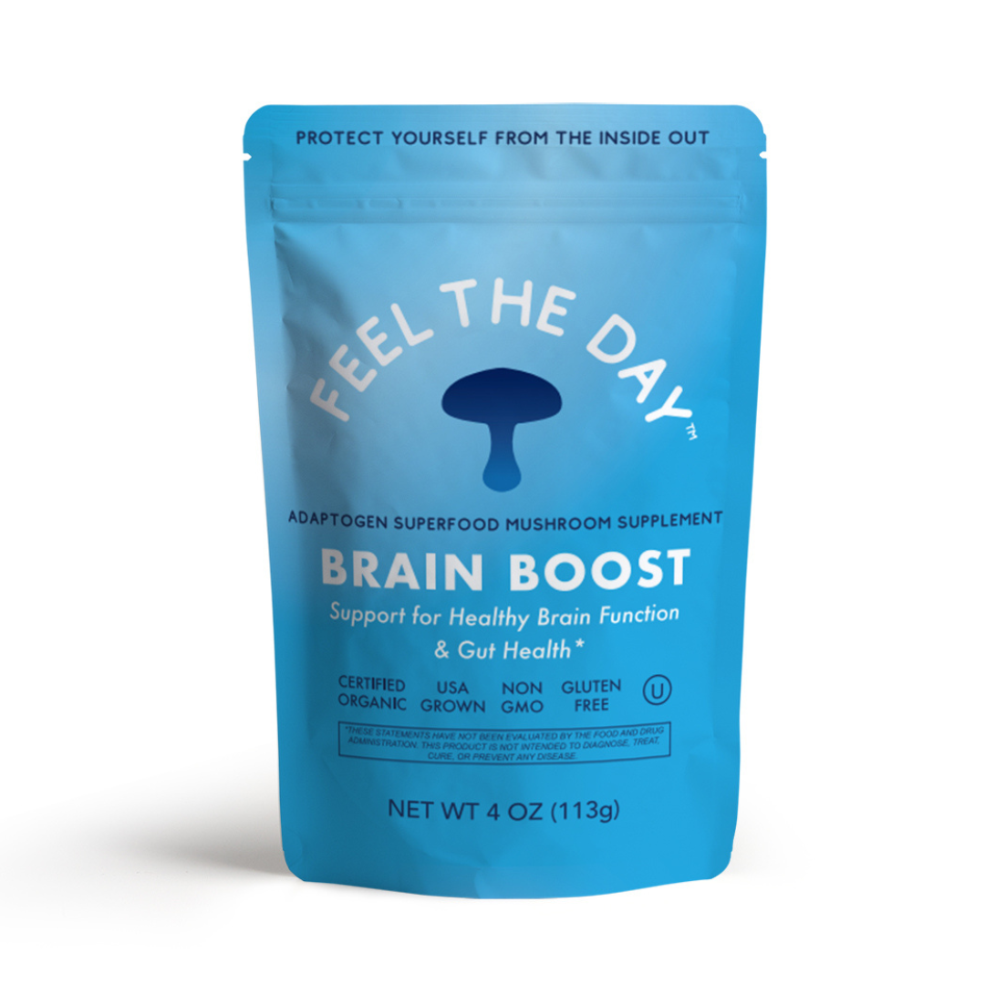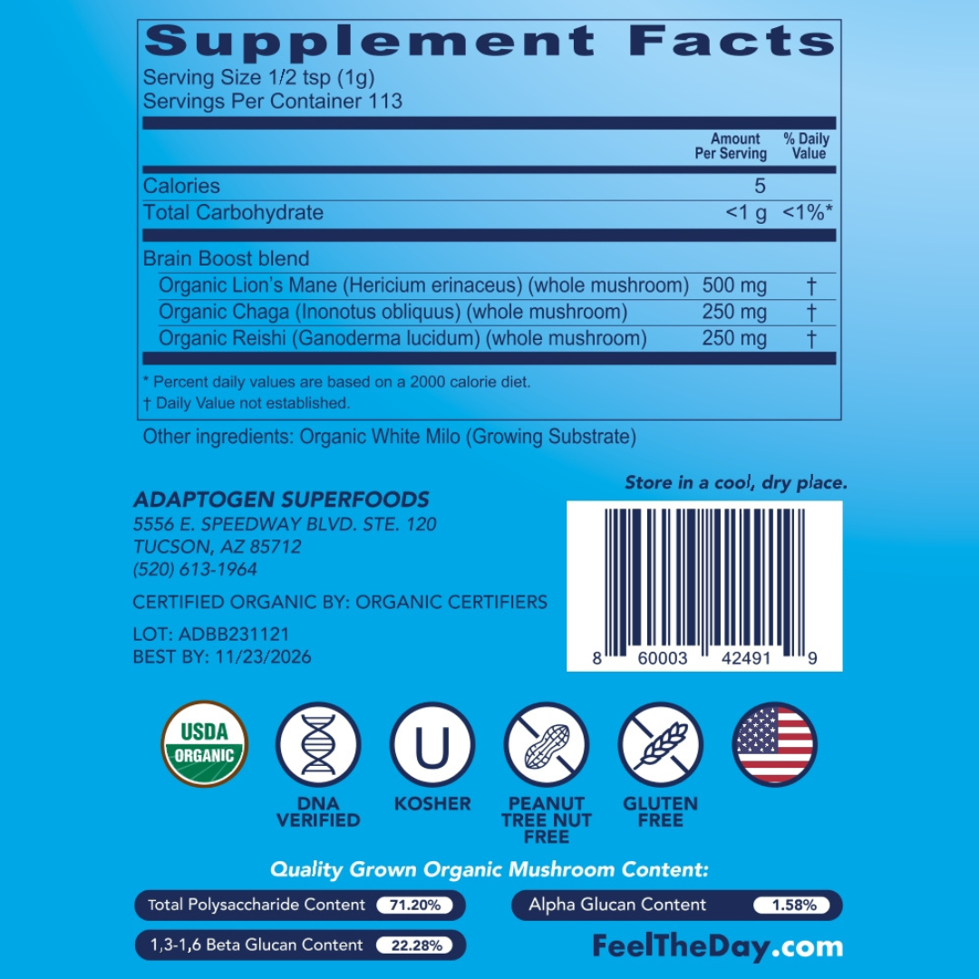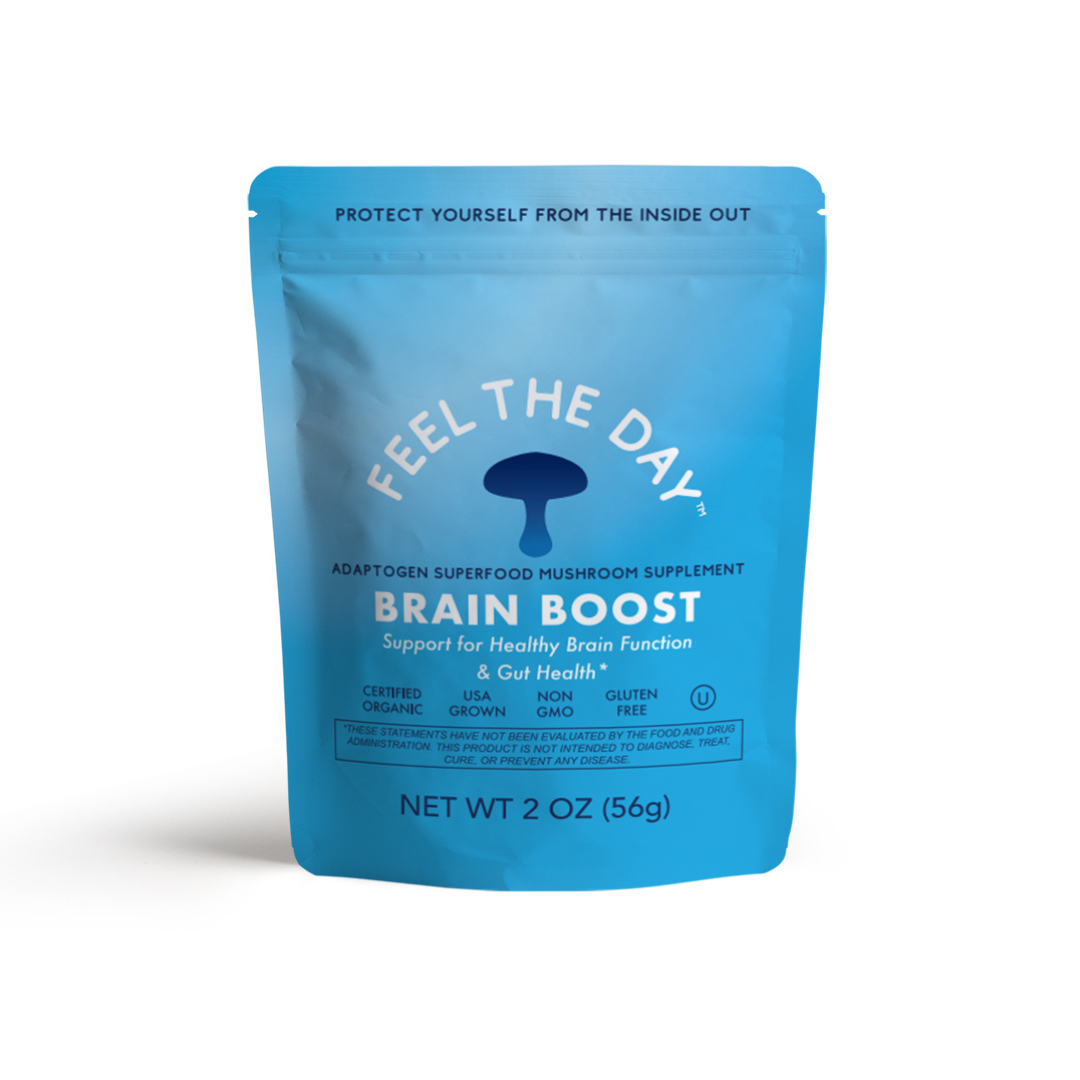 *These statements have not been evaluated by the Food and Drug Administration. This information is not intended to diagnose, treat, cure or prevent any disease. Consult with your doctor, or other qualified health care professional before using this product. Due to the thousands of species of mushrooms available the efficacy of medicinal mushrooms has not been confirmed by enough research to satisfy the FDA, and the traditional use of medicinal mushrooms does not establish that this product will achieve any claimed results since additional research is necessary for a number of reasons. Further study to confirm the findings of each different species of mushroom's best use would be ideal since the potency/formulation used in clinical studies varies not only between each study, but also between the Brain Boost formulation. Until then however, we at Adaptogen Superfoods are confident that all of the Feel the Day™ formulations have the best quality and ratio of mushrooms available today to: