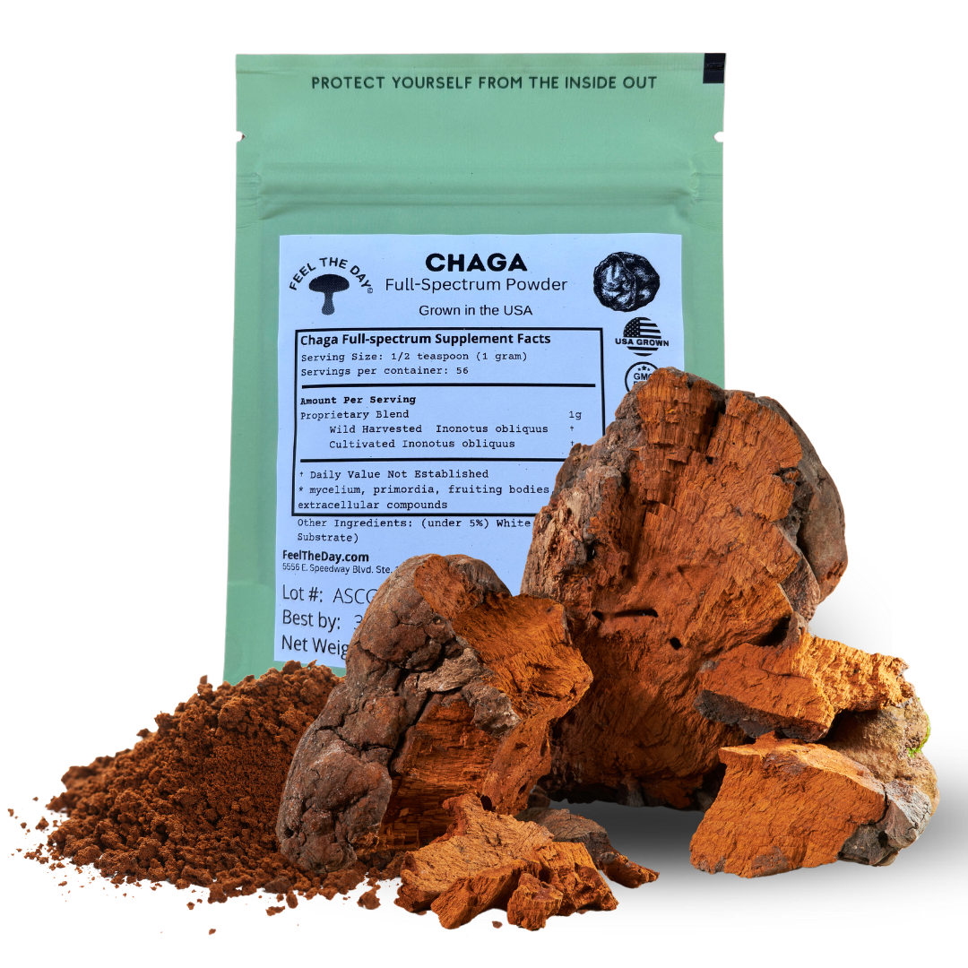 Feel The Day® Chaga mushroom supplement powder is specially heat-treated to help bring out the natural and healthy comprehensive range of constituents including polysaccharides, glycoproteins, ergosterols and triterpenoids making them more easily absorbed by your body. We never use additives or fillers, just potent, 100% full-spectrum mushrooms guaranteed to be grown in the USA. It is our mission, with Feel The Day® mushroom powder supplements, to ensure each batch of Chaga can reach its adaptogenic potential, so you can reach yours.