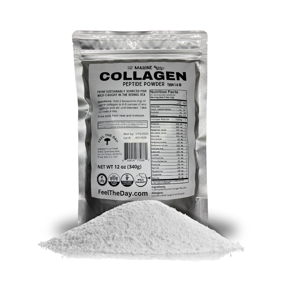 Feel The Day® Marine Collagen Peptide Powder Type I & III is 100% pure collagen peptides from sustainably sourced fish wild-caught in the Bering Sea. Enzymatic hydrolyzation breaks the collagen into small peptides with low molecular weight amino acids for optimal absorption and utilization by the body. Amino acids are the building blocks for collagen and other proteins throughout the body and essential for overall health.