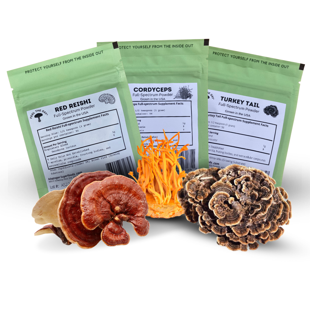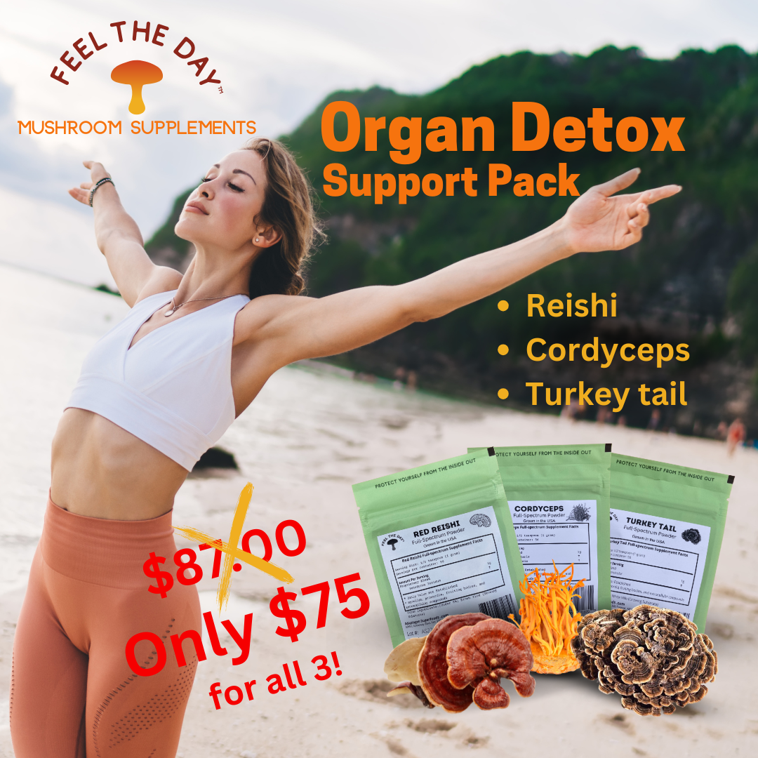 Give your body the love that it needs. You only have one so make sure it is operating in tip-top shape! The Feel The Day™ Organ Detox Support Pack contains one 2oz bag of Turkey Tail, Cordyceps, and Reishi mushroom powders. All Feel The Day™ mushroom powders are grown right here in the USA and heat treated for better bioavailability to help bring out the natural and healthy comprehensive range of constituents including polysaccharides, glycoproteins, ergosterols and triterpenoids making them more easily absorbed by your body. We never use additives or fillers, just potent, 100% full-spectrum mushrooms guaranteed to be grown in the USA. It is our mission, with Feel The Day® mushroom powder supplements, to ensure each batch can reach its adaptogenic potential, so you can reach yours.