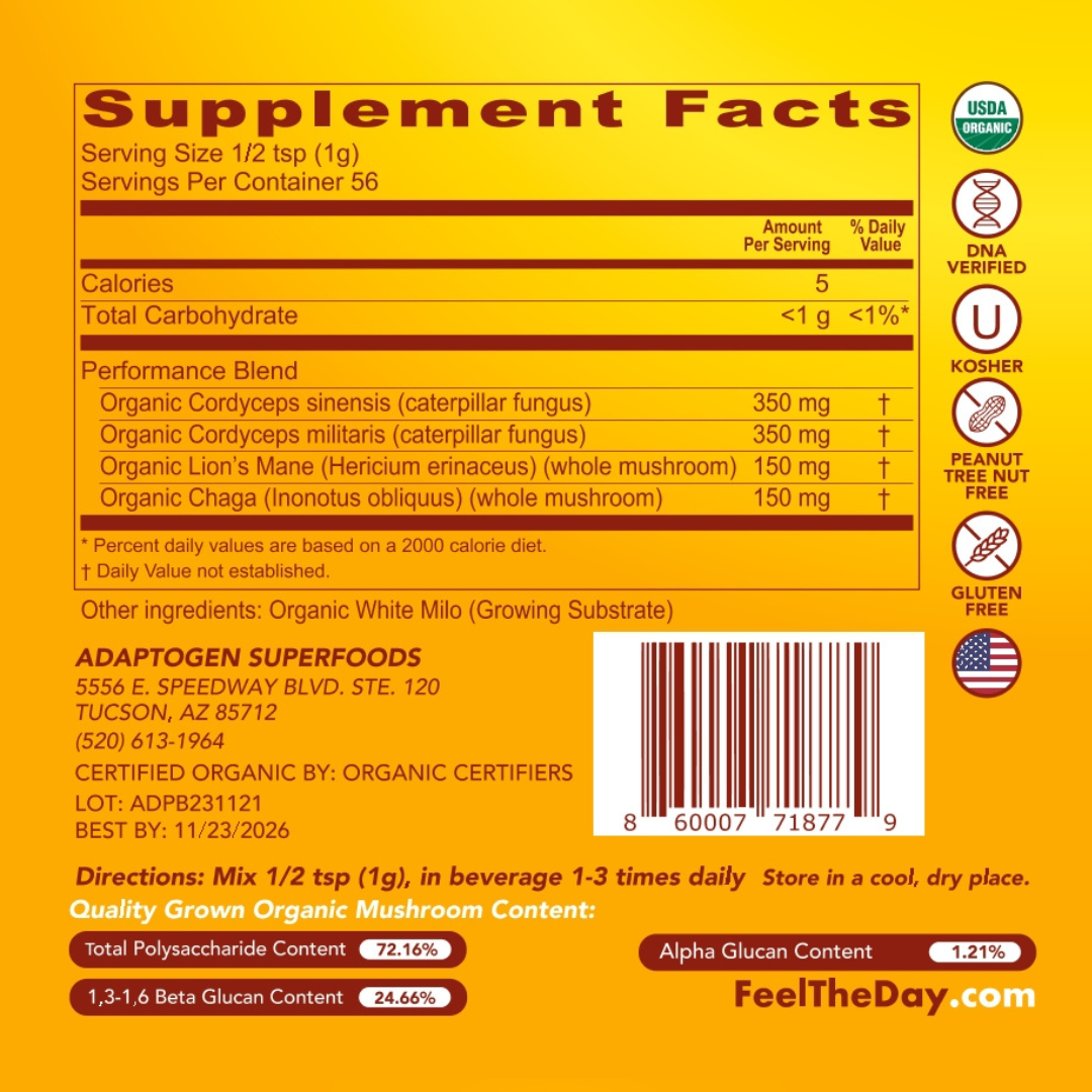 *These statements have not been evaluated by the Food and Drug Administration. This information is not intended to diagnose, treat, cure or prevent any disease. Consult with your doctor, or other qualified health care professional before using this product. Due to the thousands of species of mushrooms available the efficacy of medicinal mushrooms has not been confirmed by enough research to satisfy the FDA, and the traditional use of medicinal mushrooms does not establish that this product will achieve any claimed results since additional research is necessary for a number of reasons. Further study to confirm the findings of each different species of mushroom's best use would be ideal since the potency/formulation used in clinical studies varies not only between each study, but also between the Feel the Day™ formulations. Until then however, we at Adaptogen Superfoods are confident that our formulations have the best quality and ratio of mushrooms available today to: