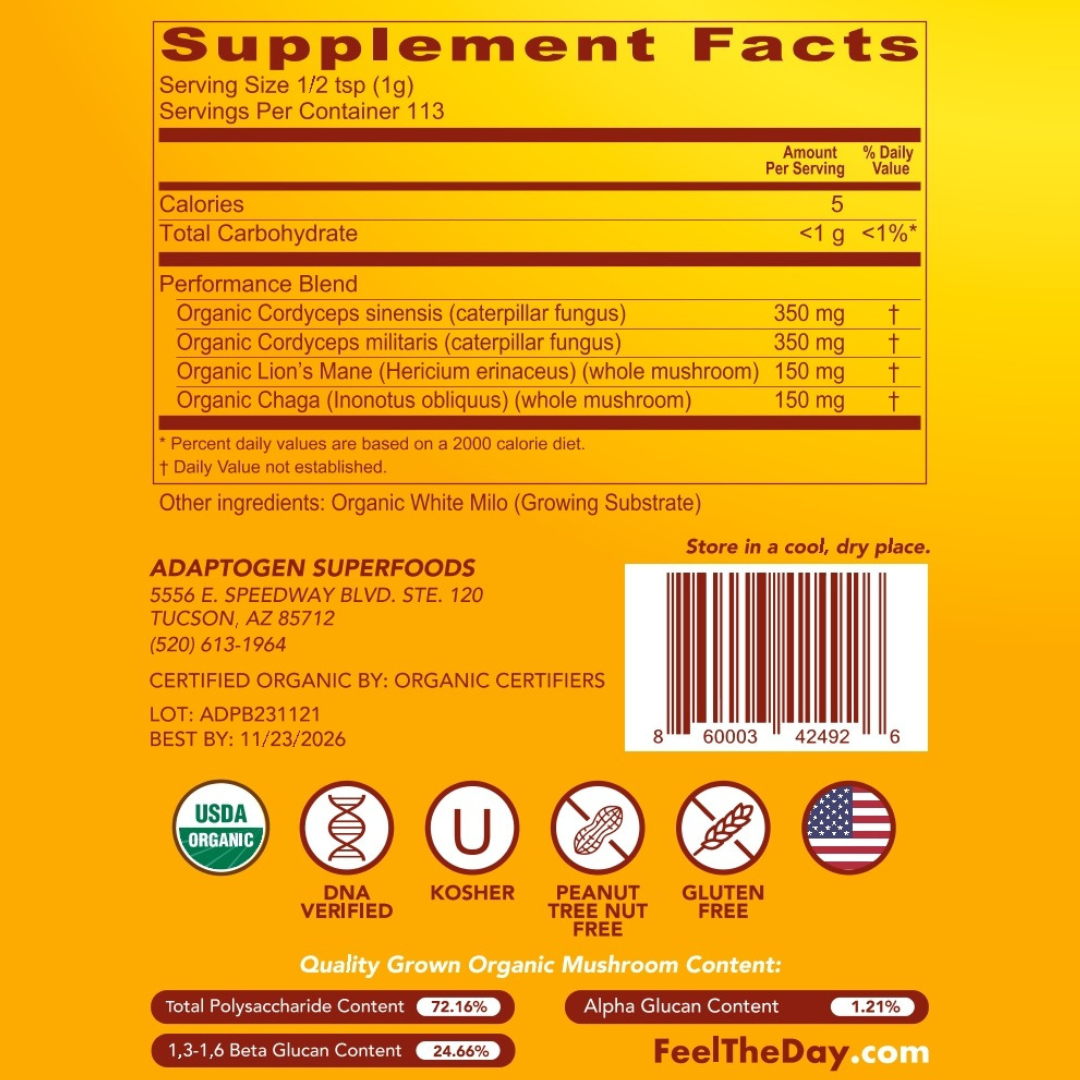 The gym is great, but not if you have no energy to get there. This is a unique blend of powerful adaptogenic, activated and dried, Certified Organic mushrooms grown in the U.S.A. that provides a comprehensive range of constituents to help support higher performance in energy, strength and endurance levels. These mushrooms in particular will work with great synergy to also promote your immune system and respiratory function, reinforces concentration, memory, cognitive functioning, and supports stress reduction.*