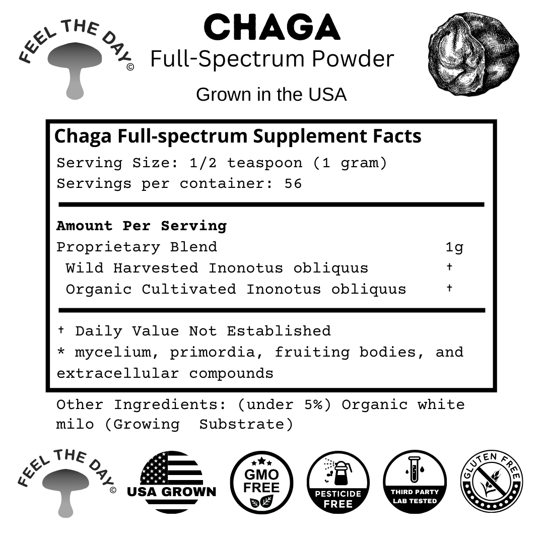 Chaga is getting a lot of attention recently. Studies are showing great potential for further study as it is getting reports worldwide for its help with inflammation and immunity support, and may even help manage diabetes and cholesterol. Feel The Day™ Chaga Full-spectrum powder provides a comprehensive range of constituents to help reinforce healthy immune function.*