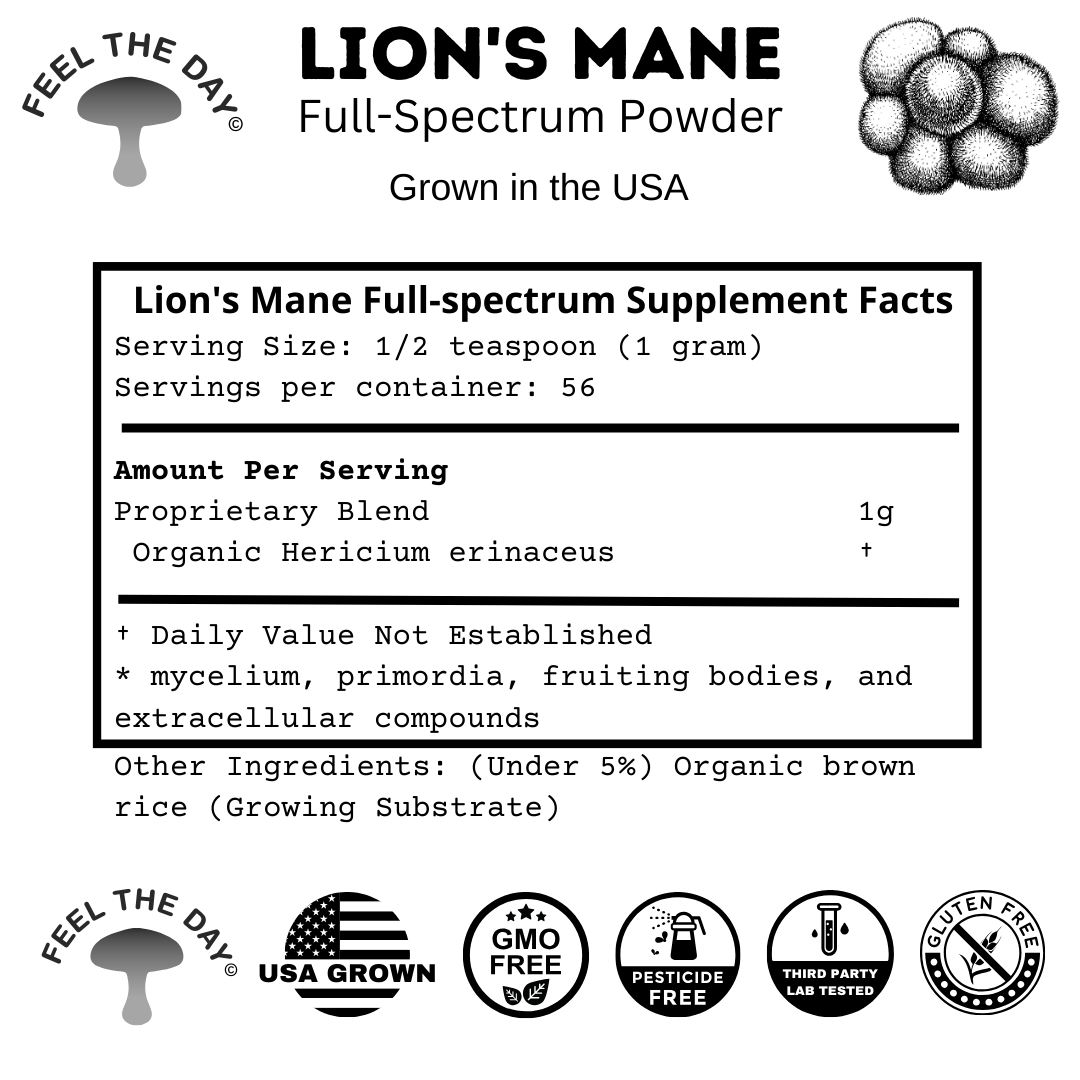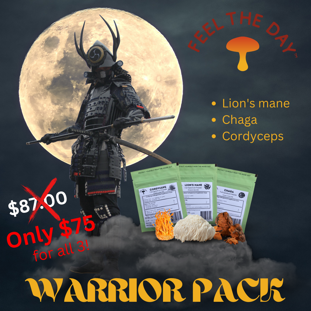 Call on the Warrior within yourself with the Feel The Day™ Warrior Pack. It contains one 2oz bag of Cordyceps, Lion's Mane, and Chaga mushroom powders. All Feel The Day™ mushroom powders are grown right here in the USA and heat treated for better bioavailability to help bring out the natural and healthy comprehensive range of constituents including polysaccharides, glycoproteins, ergosterols and triterpenoids making them more easily absorbed by your body. We never use additives or fillers, just potent, 100% full-spectrum mushrooms guaranteed to be grown in the USA. It is our mission, with Feel The Day® mushroom powder supplements, to ensure each batch can reach its adaptogenic potential, so you can reach yours.